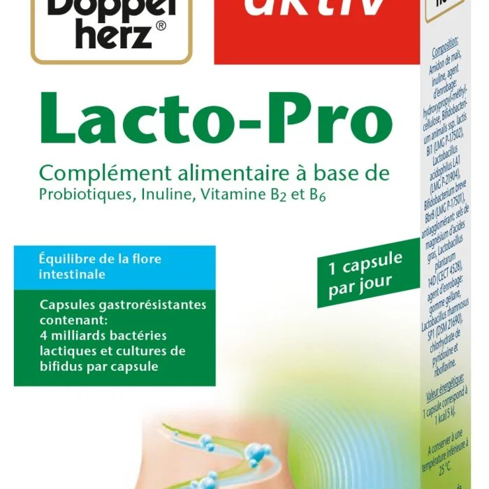 Les gélules Doppelherz aktiv Lacto-Pro contiennent deux souches de Bifidobactéries et trois souches de Lactobacilles probiotiques qui ont été spécialement choisies pour aider à régénérer une flore intestinale saine