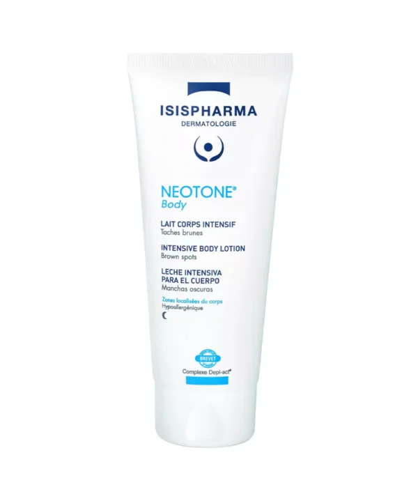Neotone Body lait corps dépigmentant, favorise l’élimination des taches pigmentaires en agissant à tous les stades de la formation des taches brunes (avant, pendant et après leur apparition) tout en rendant la peau plus douce.